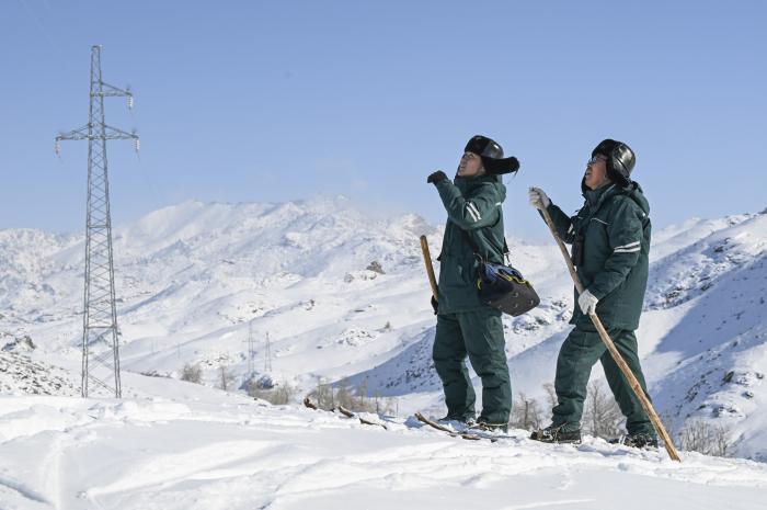 在新疆阿勒泰市汗德尕特蒙古族乡汗德尕特村,巴图别勒克·吾齐克(左)和徒弟叶思哈提·努尔兰穿着毛皮滑雪板在山上巡线(2月24日摄,无人机照片)。