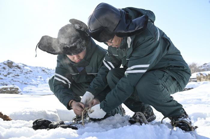 在新疆阿勒泰市汗德尕特蒙古族乡汗德尕特村,巴图别勒克·吾齐克(右)和徒弟叶思哈提·努尔兰穿着毛皮滑雪板在山上巡线(2月24日摄)。