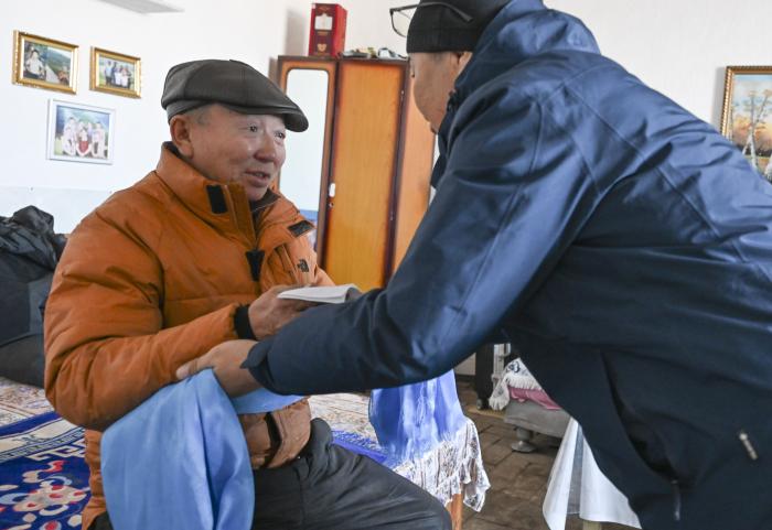 在新疆阿勒泰市汗德尕特蒙古族乡汗德尕特村,巴图别勒克·吾齐克(右)来到铁木尔加甫·卡汗别力克家中给他拜年(2月25日摄)。