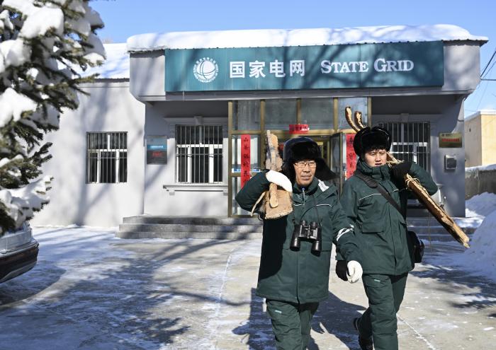 在新疆阿勒泰市汗德尕特蒙古族乡汗德尕特村,国网新疆电力有限公司阿勒泰供电公司汗德尕特乡供电所供电服务工叶思哈提·努尔兰在上山巡线前穿戴毛皮滑雪板(2月24日摄)。