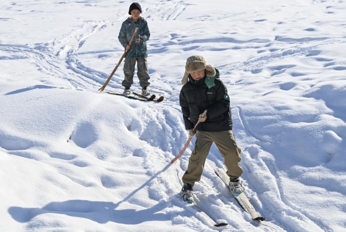 在新疆阿勒泰市汗德尕特蒙古族乡汗德尕特村,两名小朋友穿着毛皮滑雪板在滑雪(2月25摄)。