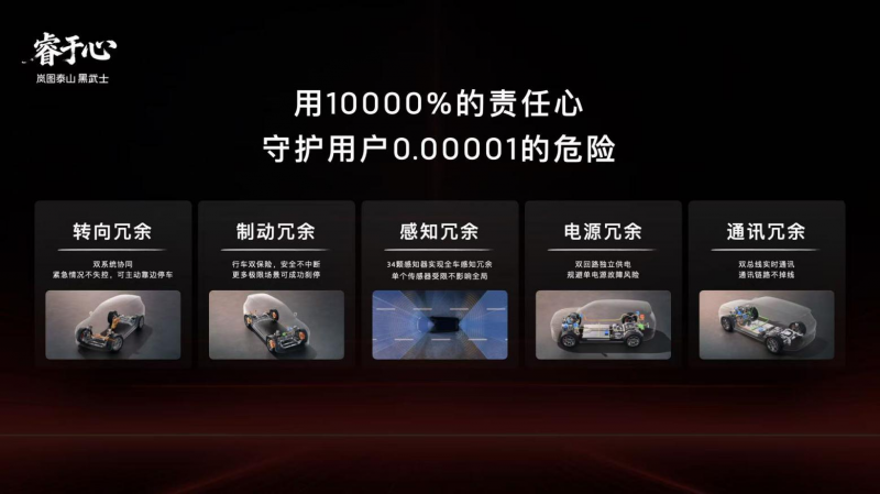 岚图泰山Ultra版基于全球首个具备L3技术能力的天元智能架构开发,深度融合岚图自主开发的青云行驶平台,采用行业顶级的五大安全冗余设计,涵盖转向、制动、感知、通讯、电源五大核心维度,通过多重备份机制彻底消除故障风险,满足L3有条件自动驾驶的安全要求,为用户出行筑牢双重保障。在央视直播测试中可以看到,岚图泰山Ultra版遇到驾驶者失能、前车掉落障碍物、异物遮挡视线等危机场景,能在第一时间做出最正确的驾驶决策,避免事故发生。在悬空、极窄或有异形障碍物的车位中泊车,岚图泰山Ultra能精准识别周围环境,高效安全完成自动泊车。