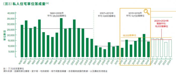 上述报告指出,去年香港私人住宅供应已经出现“断崖”,2019年经调整的私人住宅单位落成量仅有14093个,不仅较去年同期下跌了33%,更比政府官方预测的数量大幅减少30%。同时,特区政府在制定私营住宅供应目标时,忽略了过去累积的供应短缺。
