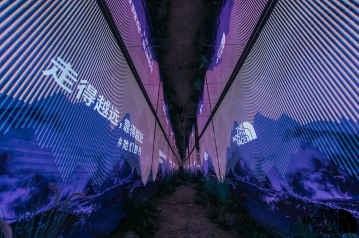 展区中,THE NORTH FACE搭构出自然氛围,邀请嘉宾在沉浸式的户外氛围中一同走出舒适圈,享受不同以往的探索之旅。山间步道将植物与LED屏巧妙融合,参观之余仿佛置身于清新自然。山涧、森林带来的罕至风景此刻触手可及。