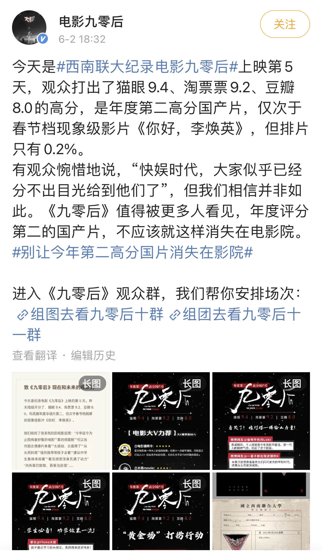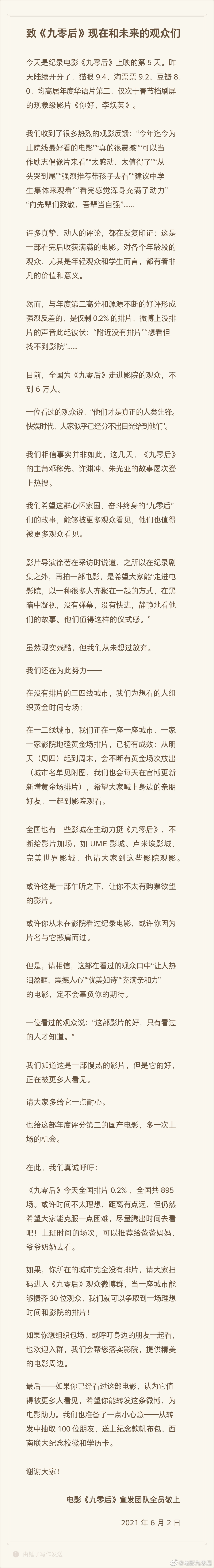 6月2日,西南联大纪录电影《九零后》在官微发布了一条该片宣发团队的信,“致《九零后》现在和未来的观众”,信中言辞恳切地表示,观众为《九零后》打出了猫眼9.4、淘票票9.2、豆瓣8.0的高分,是年度第二高分国产片,仅次于春节档现象级影片《你好,李焕英》,但排片只有0.2%。