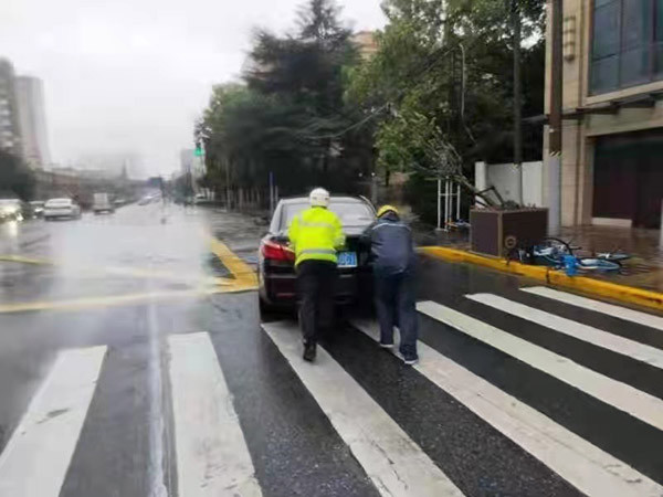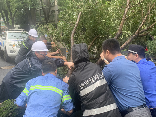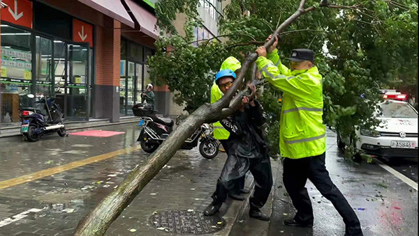 上午10时许,大风还导致杨浦区政民路行道树倒伏,五角场街道立即组织应急力量,将倒伏的树木搬至路边,道路快速恢复通行。上午10时30分许,大桥派出所民警接群众报警称,河间路近临青路处有一棵行道树被大风吹倒伏,树干将非机动车道完全堵住,存在安全隐患。民警到场后,查看现场情况,用警车做隔离,同时疏导交通。另一方面,通知消防、园林部门尽快到场处置。两位民警与热心的外卖小哥合力将树抬到人行道,暂时排除隐患。后消防队员赶到,进行后续处理。
