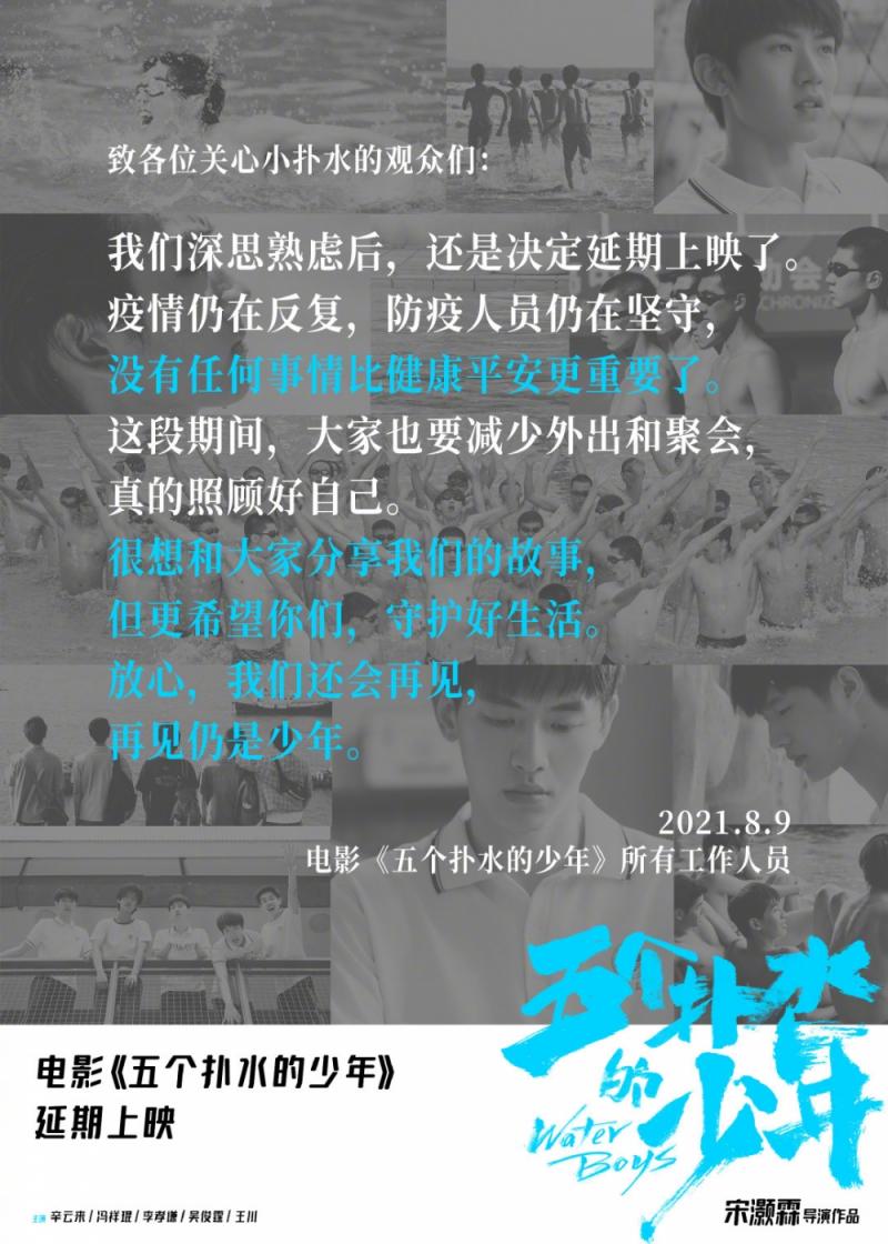 电影 《五个扑水的少年》因疫情宣布延期上映,新档期待定。原定8月13日上映。
