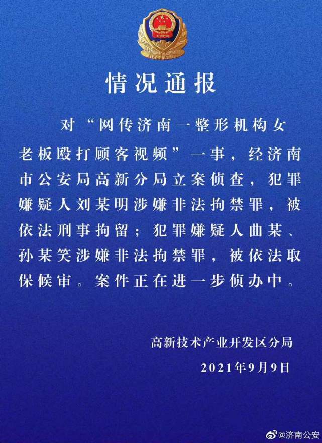 山东济南市公安局9日通报称,对“网传济南一整形机构女老板殴打顾客视频”一事,经济南市公安局高新分局立案侦查,犯罪嫌疑人刘某明涉嫌非法拘禁罪,被依法刑事拘留;犯罪嫌疑人曲某、孙某笑涉嫌非法拘禁罪,被依法取保候审。案件正在进一步侦办中。