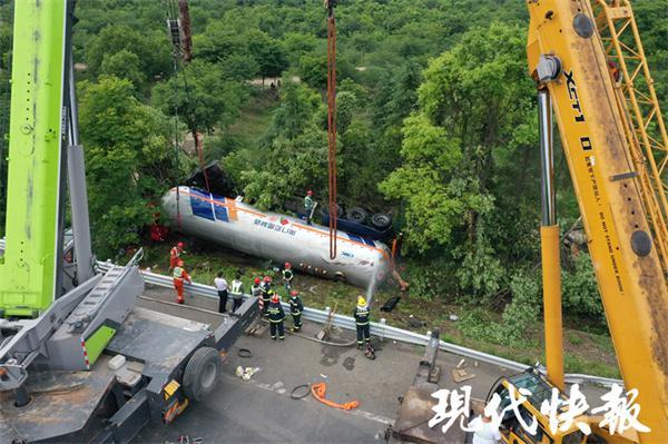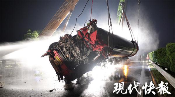 在现场水枪的掩护下,现场救援人员指挥2台重型吊机负责吊升,2台重型吊机负责扶正,成功将液化石油气槽罐车整体吊至高速公路路面,并将损毁车头与罐体成功分离,随后分别吊运至等在一旁的驳载平板车上,在消防车监护下,运至丹阳生命科学产业园移交地方政府处置。截至22时许,事故处理完毕。