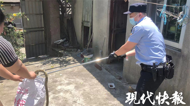“我家里有一条大蛇,两米长,也不知道有没有毒,你们快来看看吧!”5月17日上午11点左右,南京市公安局江北新区分局特巡警支队十村警务站接到居民王女士报警后,立即安排民警前往现场。