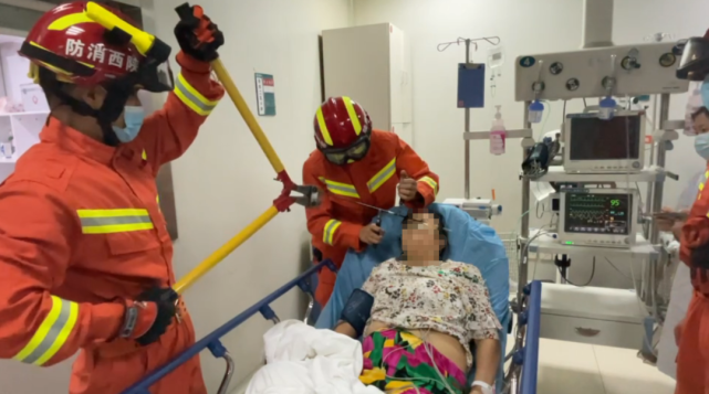 6月9日晚8点,西安消防接群众报警称,西京医院一患者因弓箭插入脸部,需消防协助处置。金花北路消防救援站接警后,立即赶往现场。