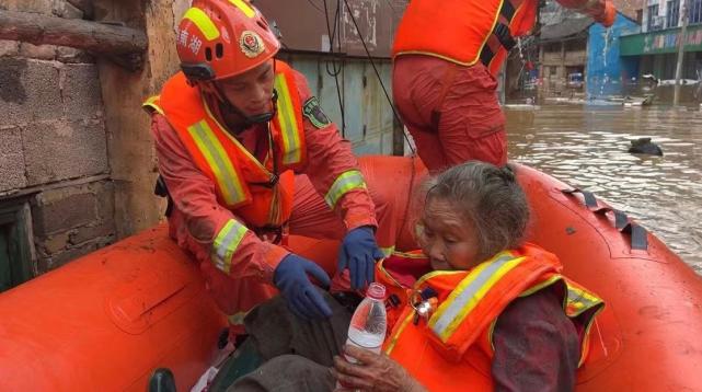 13时44分,消防救援人员到达现场,经过勘察发现,老人的房子大门已经无法打开,老人孤身一人在家,腿脚不便。屋外,消防救援人员听到老人的呼叫声“屋里还有一个人,救我,救我,走不了了,救我。”情况紧急,消防救援人员立刻展开救援。2名消防救援人员从屋顶进入屋内寻找老人,另外2名消防救援人员在橡皮艇上做好转移准备。13时46分,顺利找到老人,消防救援人员为老人穿上救生衣,合力将老人移送到屋顶,并搀扶着老人小心翼翼的从屋顶转移到橡皮艇上,随后送上了饮用水。