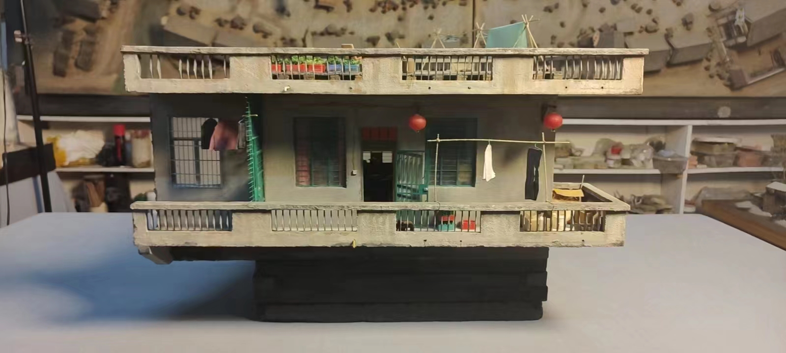 采访中,李寿升告诉记者,制作微缩模型最重要、最难把控的是比例。从收集视频、图片资料,到设计三维立体图和平面图,准备材料,再进行制作、打磨、上色、做旧、拼装,材料包括染料、纸板、泡沫板,各种各样的工具多达数十种。虽然制造成本不高,泡沫、铝片、铁丝这些材料在寻常文具商店就可以买到,但投入的人力成本很高。“我和表弟在工作室里安静工作,常常一坐就是一整天”,一系列的流程下来,两人耗时11天,以1:20的比例成功完成高启强老家模型的复刻工作。