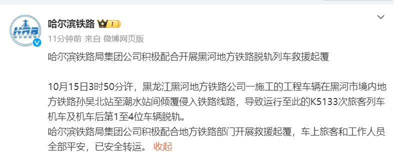10月15日3时50分许,黑龙江黑河地方铁路公司一施工的工程车辆在黑河市境内地方铁路孙吴北站至潮水站间倾覆侵入铁路线路,导致运行至此的K5133次旅客列车机车及机车后第1至4位车辆脱轨。