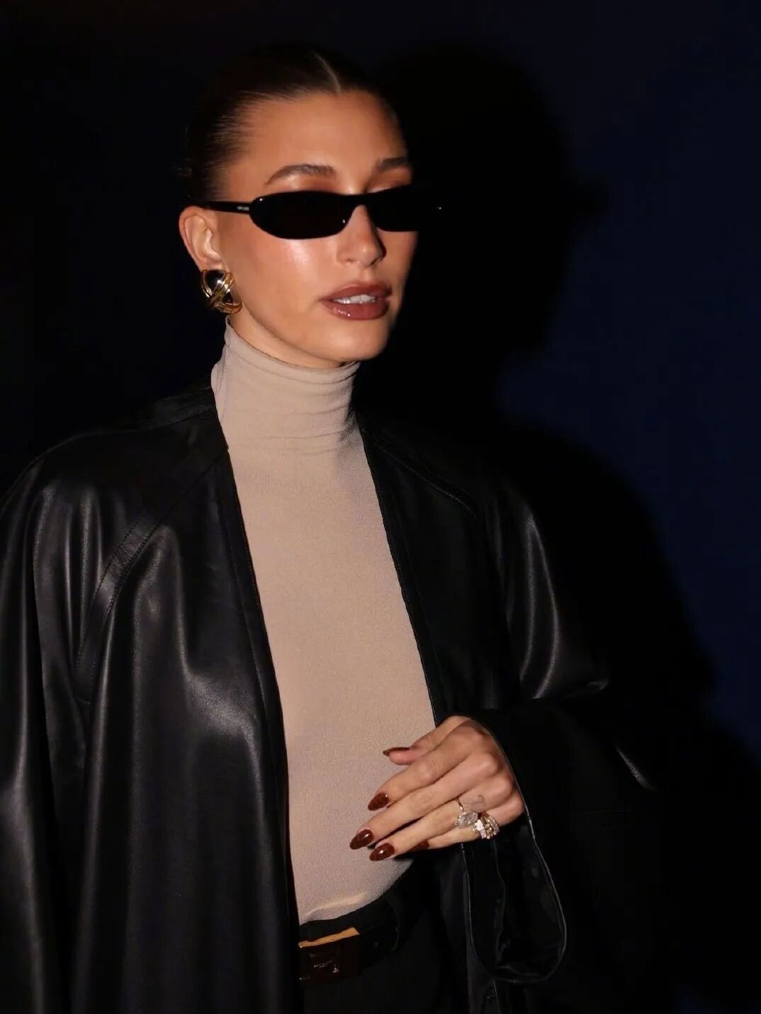 Hailey Bieber很喜欢轻薄的羊绒衫款式,叠穿深棕色系单品,也不会冗余累赘。