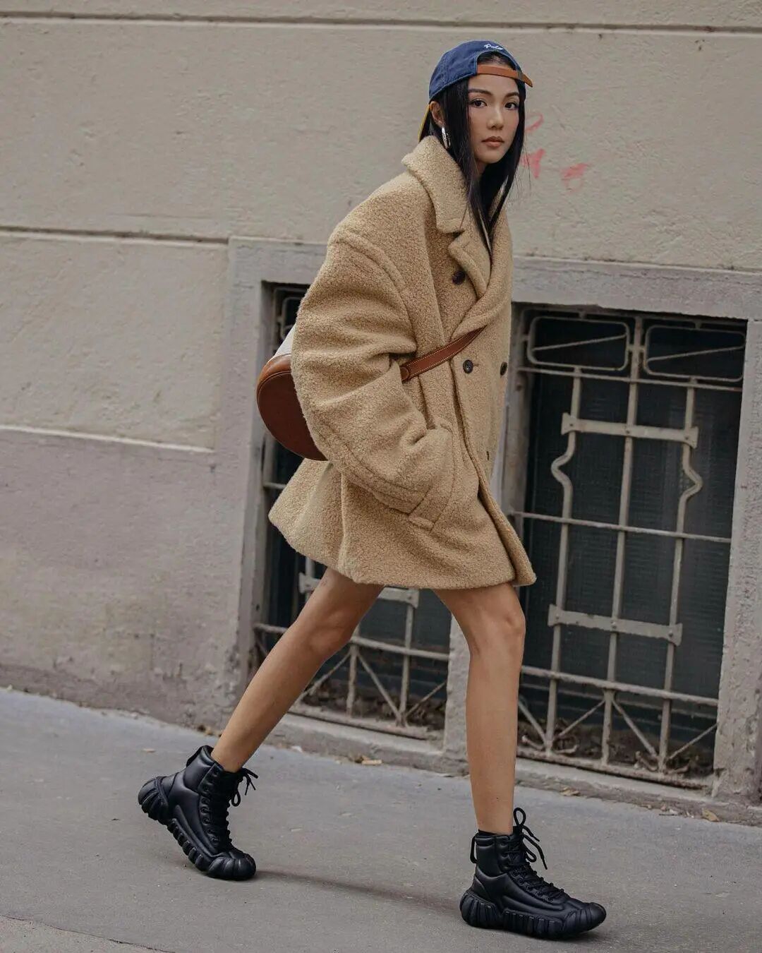 不用刻板遵守美拉德的色彩游戏,适当加入一些其他颜色,像博主Yoyo Cao加入蓝色棒球帽和黑色球鞋作衬托,颗粒绒大衣就有了动感活力。