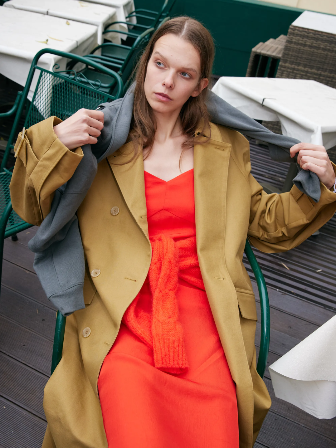 Anouk Yve另外一套风衣搭配里面穿的是橘色毛衣,换了穿法,橘色的小面积点缀效果仍是一样的。