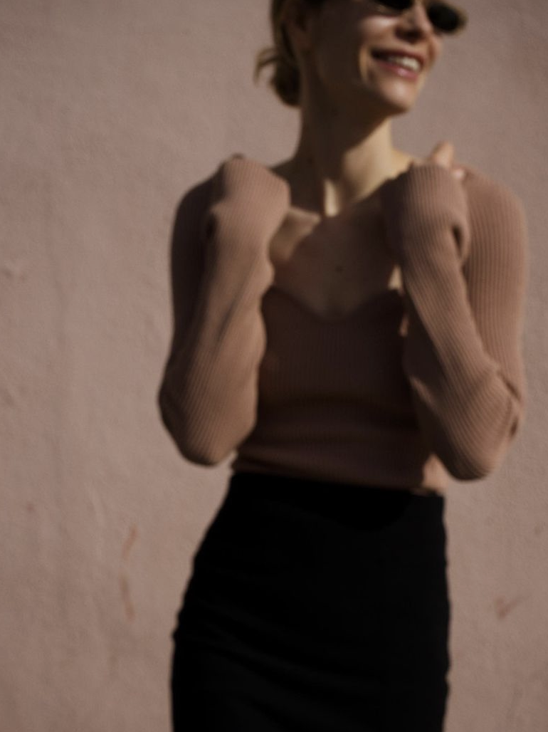 向来痴迷棕色系的Anouk Yve,有更宜人参照的穿法。更大程度保留了缎面本来的气质,一件宽松浅米棕毛衣长及臀部,隐去曲线,也遮住身材缺点,最终仍没有隐没缎面裙的知性优雅。