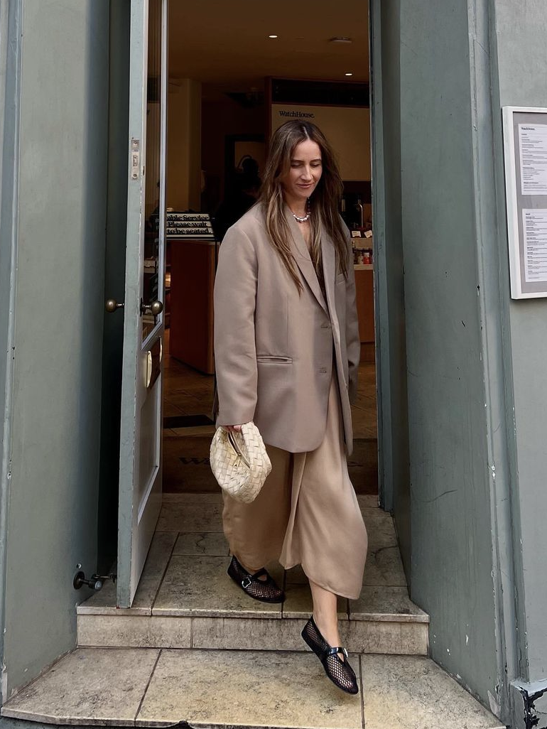 另外,还有麂皮,自带做旧质感,光泽暗哑低调,博主Camille Charriere穿着的麂皮套装,流畅的剪裁透露着不菲的价格,很有老钱的腔调。
