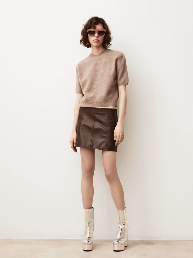 实在是厚实的款式,就挑选短袖、大领口的设计吧,同样能给予棕色调注入空气感。