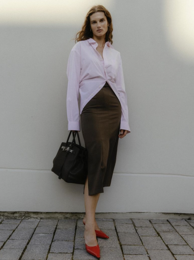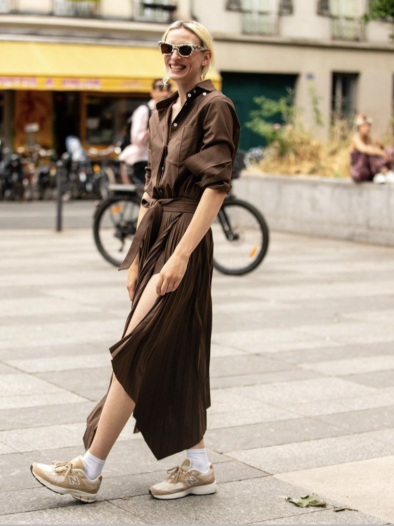 模特Maggie Maurer这套是最近想一键复制的心动搭配,一条棕色的开衩衬衫裙还不够,连带脚上的New Balance也要换成了浅棕色,色调直白干净,穿着又十分舒适。