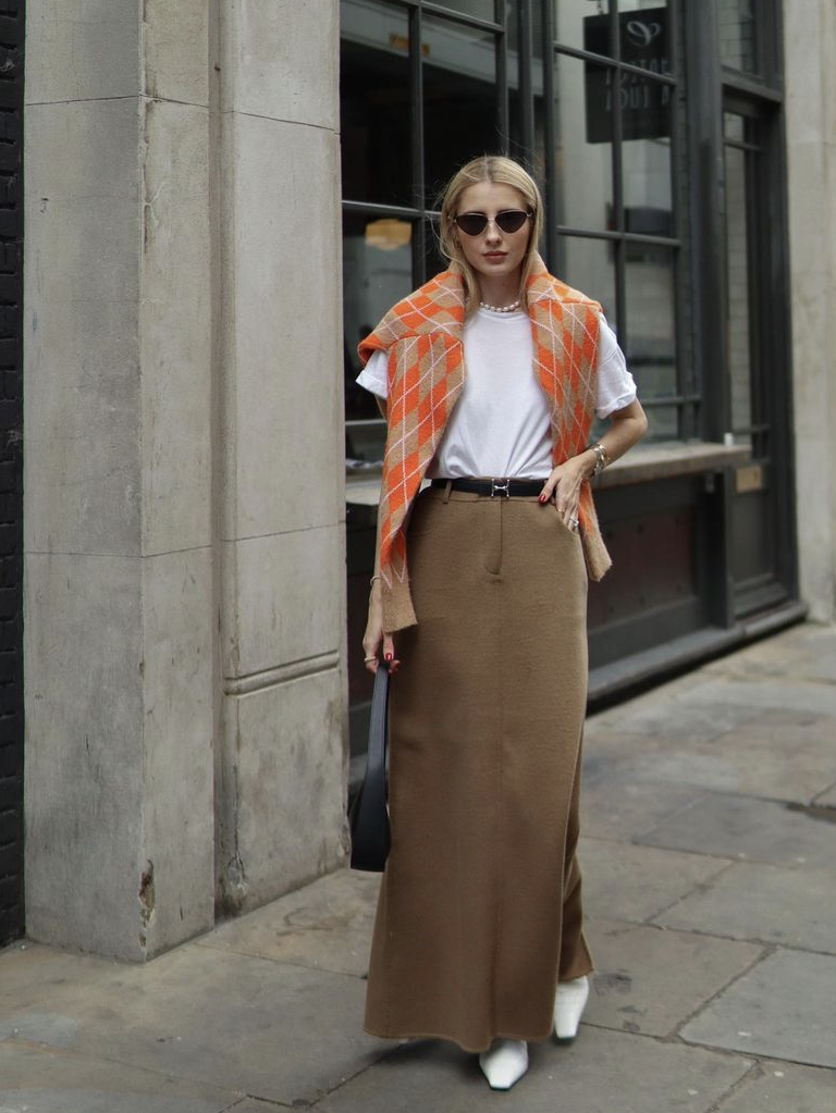 也可以像博主Valeria 这般,做年轻活力的美拉德女孩。一条小A版的暖棕色羊绒裙,减少了对双腿的束缚,而橘色的针织为整身增添了明媚气息,羊绒裙也不那么显成熟了。