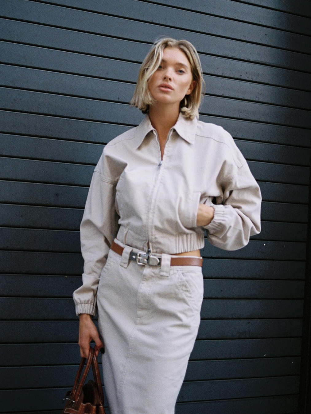 瑞典超模Elsa Hosk ,用一件 Notsonormal 的扎染T恤搭配 Cham 的半裙,再戴上棕色墨鏡和 BV的编织手袋,「tone on tone」的穿法让棕色调的层次和材质尽可能丰富,适当的露肤也不会有闷感。