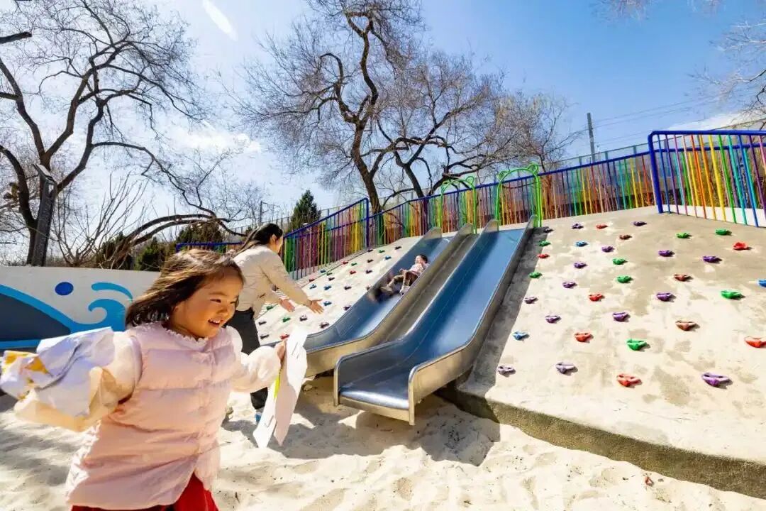 进入银地花园,最引人注目的要数园区中段的儿童乐园,众多老人孩子在此相聚,在欢乐中开启新的一天。儿童活动区内设置有滑梯、沙坑、蹦床、攀爬网、涂鸦板、秋千等丰富的游憩设施,孩子们沉浸其中,流连忘返。