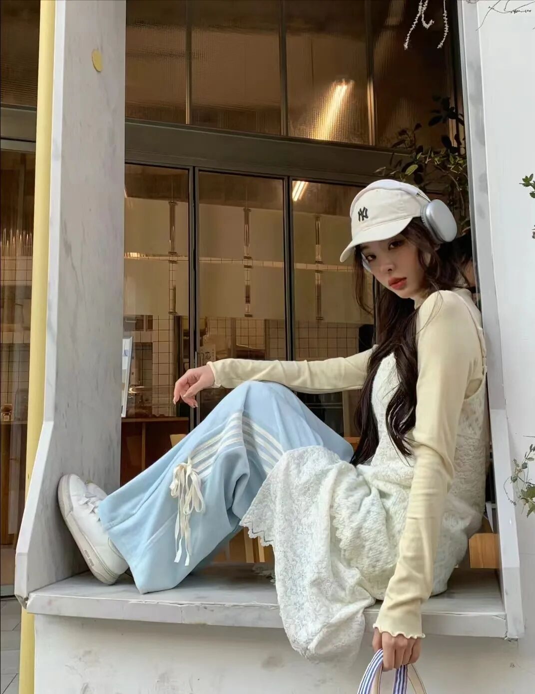 这一套来自韩国留学生的韩系甜妹风叠穿,选择了吊带蕾丝裙搭配蓝色运动风阔腿裤,将“屁帘”换成吊带裙,让穿搭更加多元化,能够不局限于一片式蕾丝纱搭配浅蓝色牛仔裤。