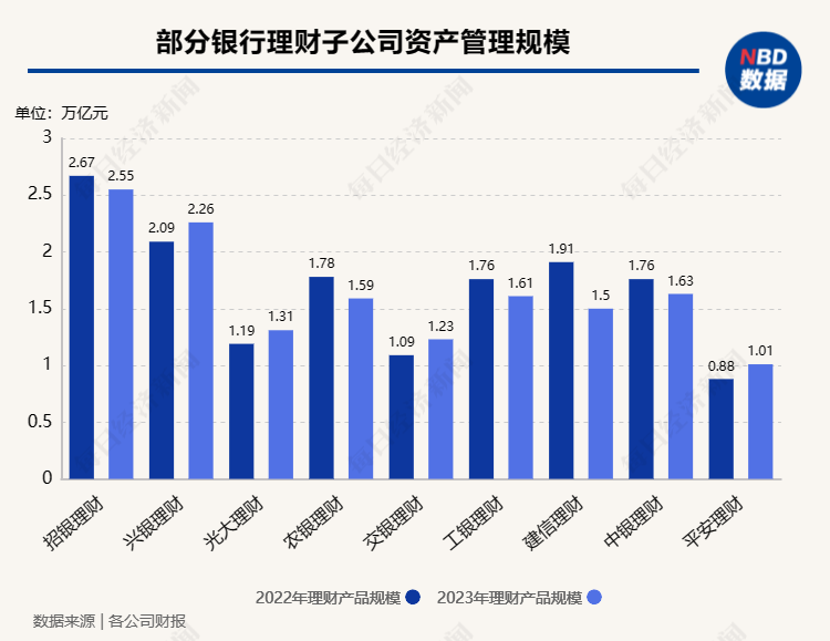 从已披露的年报数据来看,招银理财、兴银理财、光大理财,以及五家国有银行旗下的理财子公司资产管理规模都分别超过了一万亿元。