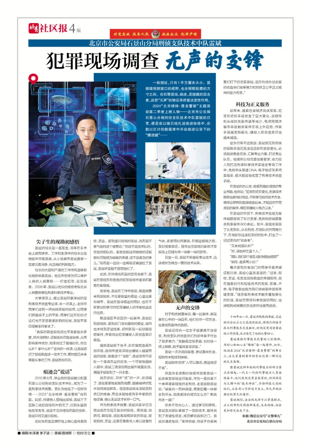 2024“北京榜样·最美警察”主题活动第二季度上榜人物——北京市公安局石景山分局刑侦支队技术中队雷斌的日常,便是夜以继日地扎进痕迹脉络中,在数以亿计的数据库中开启痕迹记录下的“播放键”……