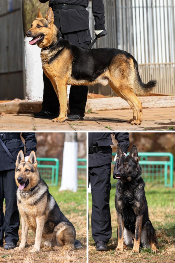 拼版照片:上图为1月5日在公安部昆明警犬基地拍摄的一只黑背品系昆明犬(新华社记者 江文耀 摄);左下图为1月5日在公安部昆明警犬基地拍摄的一只草黄品系昆明犬(新华社记者 高咏薇 摄);右下图为1月5日在公安部昆明警犬基地拍摄的一只狼青品系昆明犬(新华社记者 江文耀 摄)。