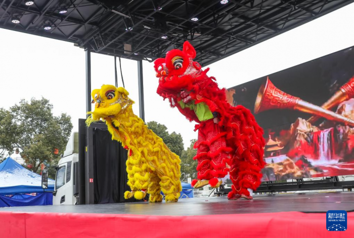 2月7日,民间艺人在江苏省句容市举办的年货大集活动中表演舞狮。