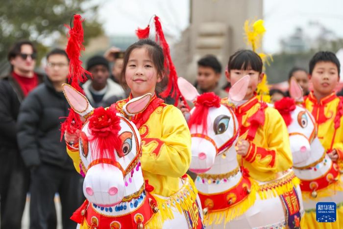 2月7日,外国留学生在江苏省句容市举办的年货大集活动中体验“马灯阵舞”表演。