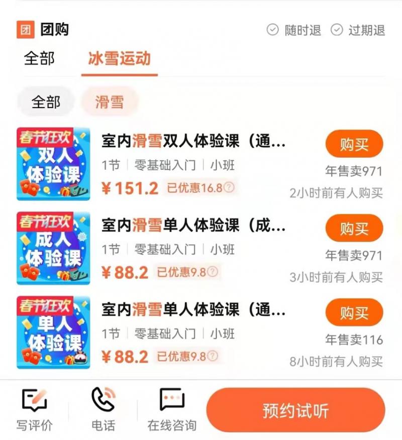 打开大众点评App可以看到,除了户外滑雪场、冰雪主题乐园,不少城市中的滑雪俱乐部人气爆棚,推出的新春特惠滑雪、滑冰体验课程,吸引了不少滑雪初学者前来体验。