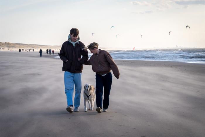 3月15日,一对情侣在荷兰诺德韦克海滩遛狗。