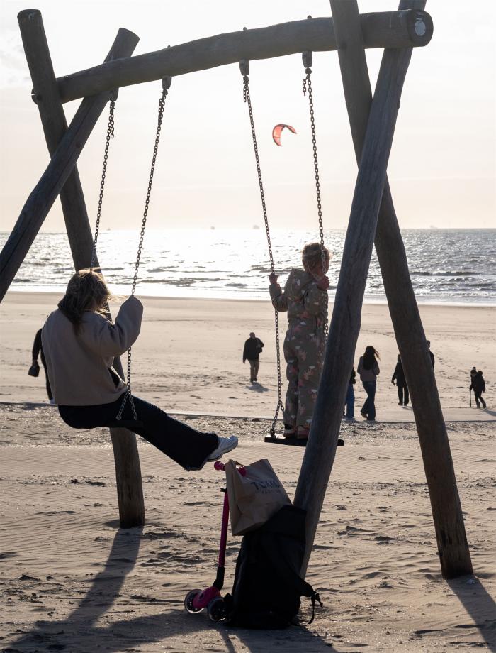 3月15日,游人在荷兰诺德韦克海滩荡秋千。