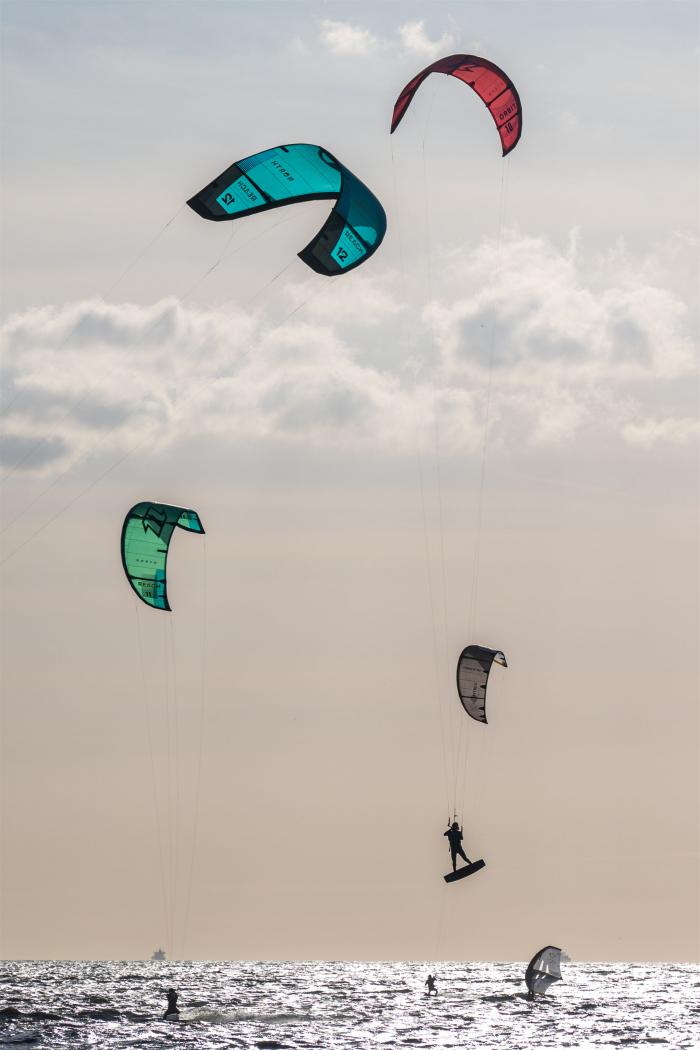 3月15日,在荷兰诺德韦克海滩,冲浪爱好者参与风筝冲浪。