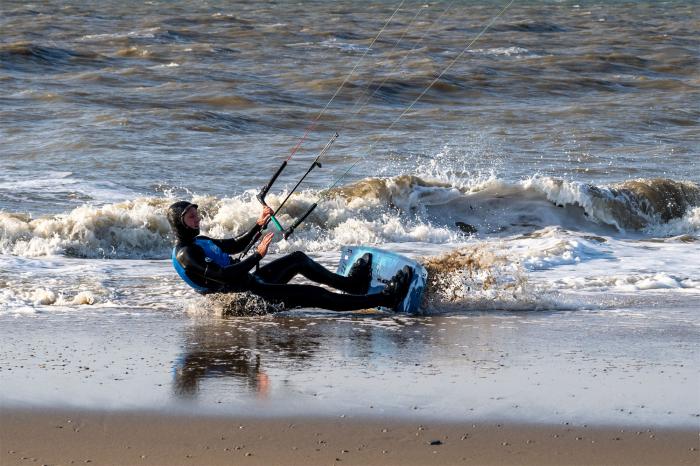 3月15日,在荷兰诺德韦克海滩,一名男子体验风筝冲浪。