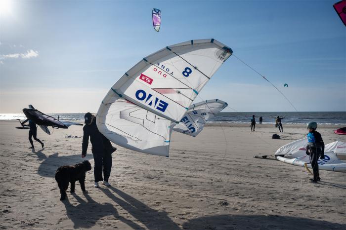 3月15日,在荷兰诺德韦克海滩,一个男孩(右)准备参与风筝冲浪。