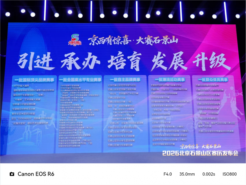 仪式以“国际赛道·顶尖赋能”、“国赛枢纽·专业筑基”、“山水赛道·逐梦滨河”、“潮玩引擎·数智未来”、“全民热力·花园城韵”五大篇章,详细解读了石景山区精心构建的“五个一批”赛事体系,发布全年共76项赛事日历,其中引进10项国际顶尖品牌赛事、举办26项全国高水平专业赛事、培育15项自主品牌赛事、发展15项潮流运动赛事、升级10项群众体育赛事。赛事日程贯穿春夏秋冬四季,深度绑定节假日、寒暑假,实现“周周有活动、月月有亮点”,为广大市民与运动爱好者呈现全年体育盛宴。