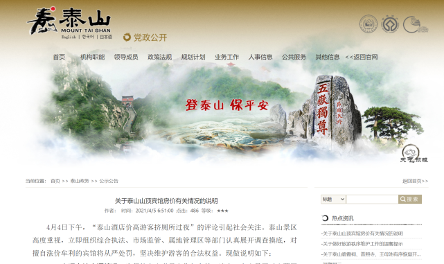 4月5日上午,泰山风景区在其官网上发布公告。4月4日下午,“泰山酒店价高游客挤厕所过夜”的评论引起社会关注。泰山景区高度重视,立即组织综合执法、市场监管、属地管理区等部门认真展开调查摸底,对擅自涨价牟利的宾馆将从严处罚,坚决维护游客的合法权益。