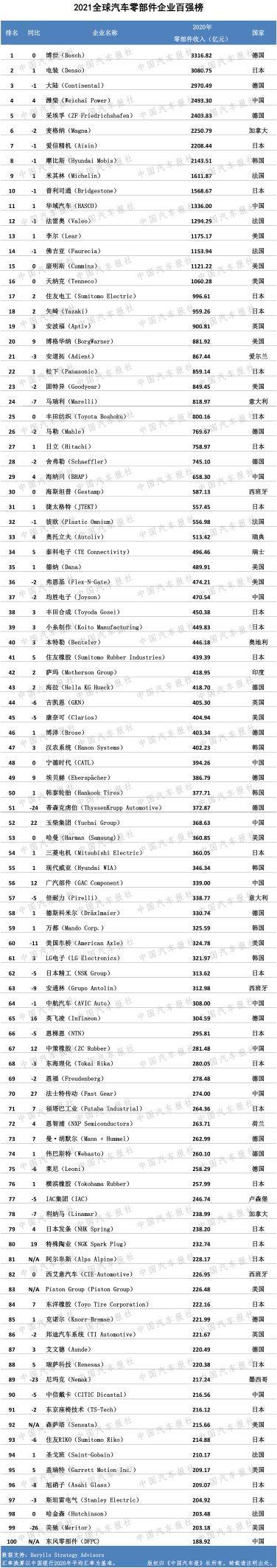 据2021年汽车零部件企业“双百强”榜单显示,全球百强榜中共有12家中国企业入围,潍柴集团、华域汽车、北京海纳川、宁波均胜电子、宁德时代、玉柴集团、广汽零部件、中航汽车、中策橡胶、法士特集团、中信戴卡、东风零部件,分别列百强榜的第4、第11、第29、第37、第48、第52、第56、第64、第67、第70、第90、第100位。值得一提的是,这12家上榜全球百强的中国零部件企业有8家较去年排位有增所幅,特别是法士特和玉柴集团,分别增幅27位和22位。