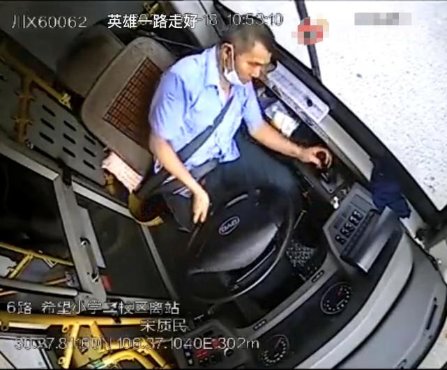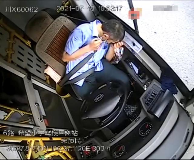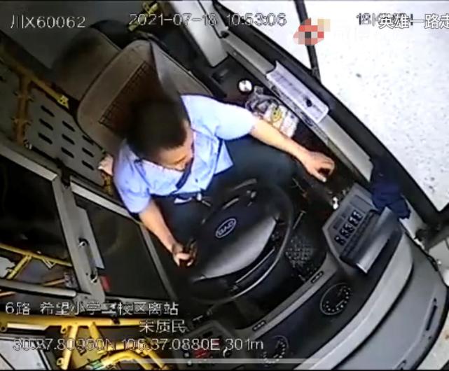 7月20日下午,北青-北京头条记者从四川广安广泰公共交通公司相关负责人杨女士处了解到,7月18日10点53分许,宋质民驾驶6路公交车在希望小学二校区公交站接完乘客,据监控显示,车辆在快到路口时,宋质民突然捶胸口,他整理了安全带,于10点53分6秒左右用左手拉好手刹将车停稳,然后就晕倒了。
