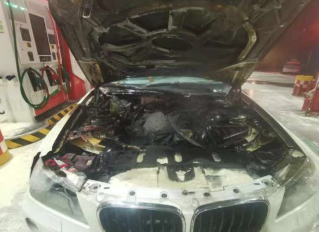 好在,车头开始冒浓烟时,加油站的工作人员就拿起身边的灭火器处置起来。“他们朝着车头部位喷了大概有十几瓶干粉灭火器,我们赶到的时候,明火其实已经被扑灭了。”消防员说。