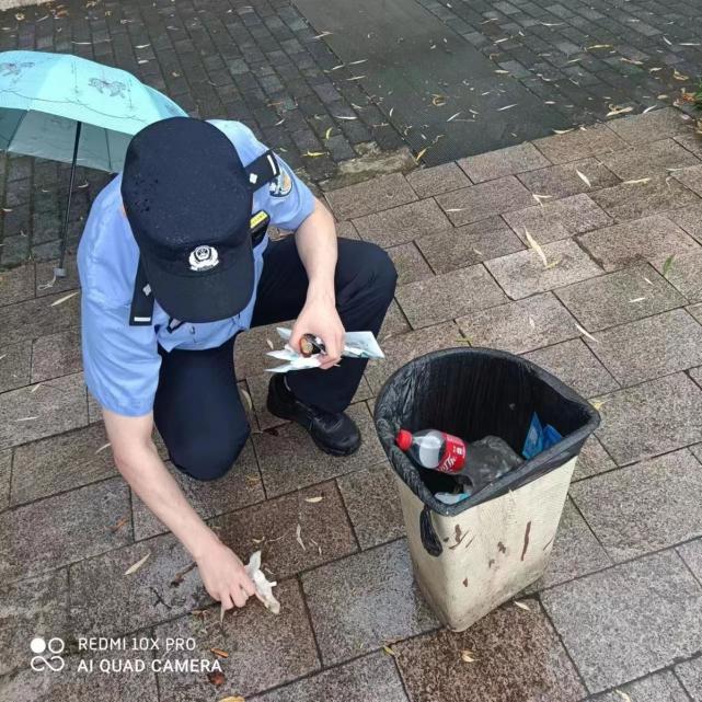 18日上午,民警确认了男子的身份信息,并与其取得了联系。在民警做了法律政策宣传后,该男子当日下午将包送回了派出所,但包内财物被丢弃在汉江沿岸的垃圾桶。由于无法得知具体位置,民警刘延江辅警王文强便前往江边翻找。“要是找不回票据,报警人将面对很多的麻烦和困难,想到这我们也顾不上干净了。”夏日雨后,高温蒸腾下的垃圾桶泛着一股刺鼻的异味,两人却顾不上这些,沿路仔细翻找了6个垃圾桶,最终寻回了身份证、票据等全部财物。