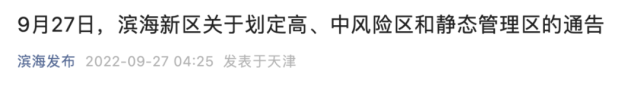 9月27日凌晨4点25分,“滨海发布”发布消息称,滨海新区发布了《关于划定高、中风险区和静态管理区的通告》。