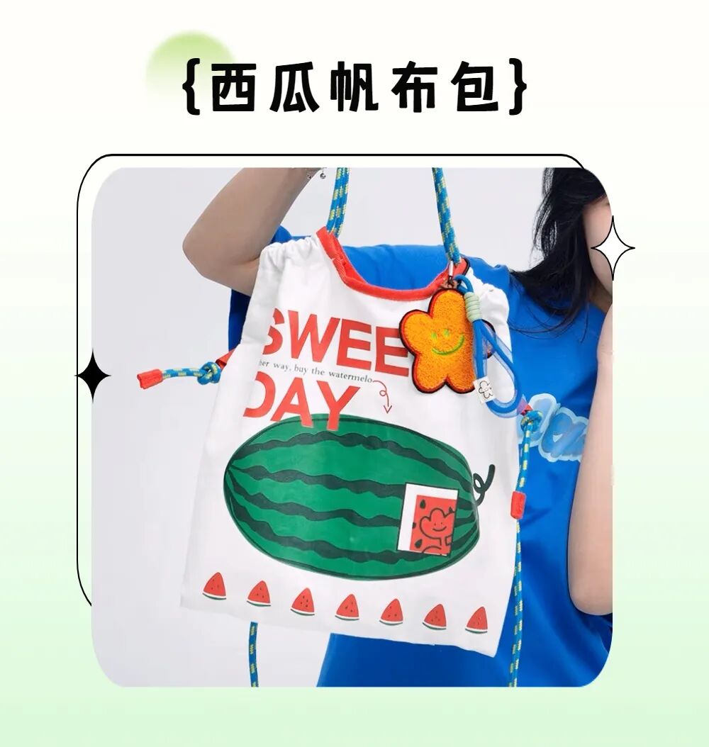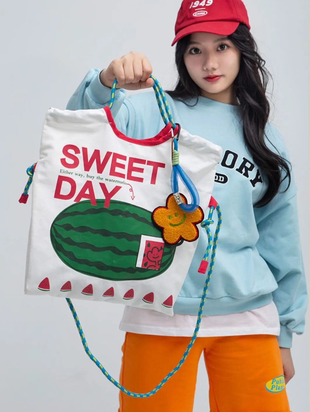 夏天嘛就要换上夏日感一点的包包啦,这款包包有着超级可爱的西瓜印花,整体配色也很西瓜,边缘是西瓜红,包包上边还写着“sweet day”,代表着每天都跟西瓜一样甜呀!