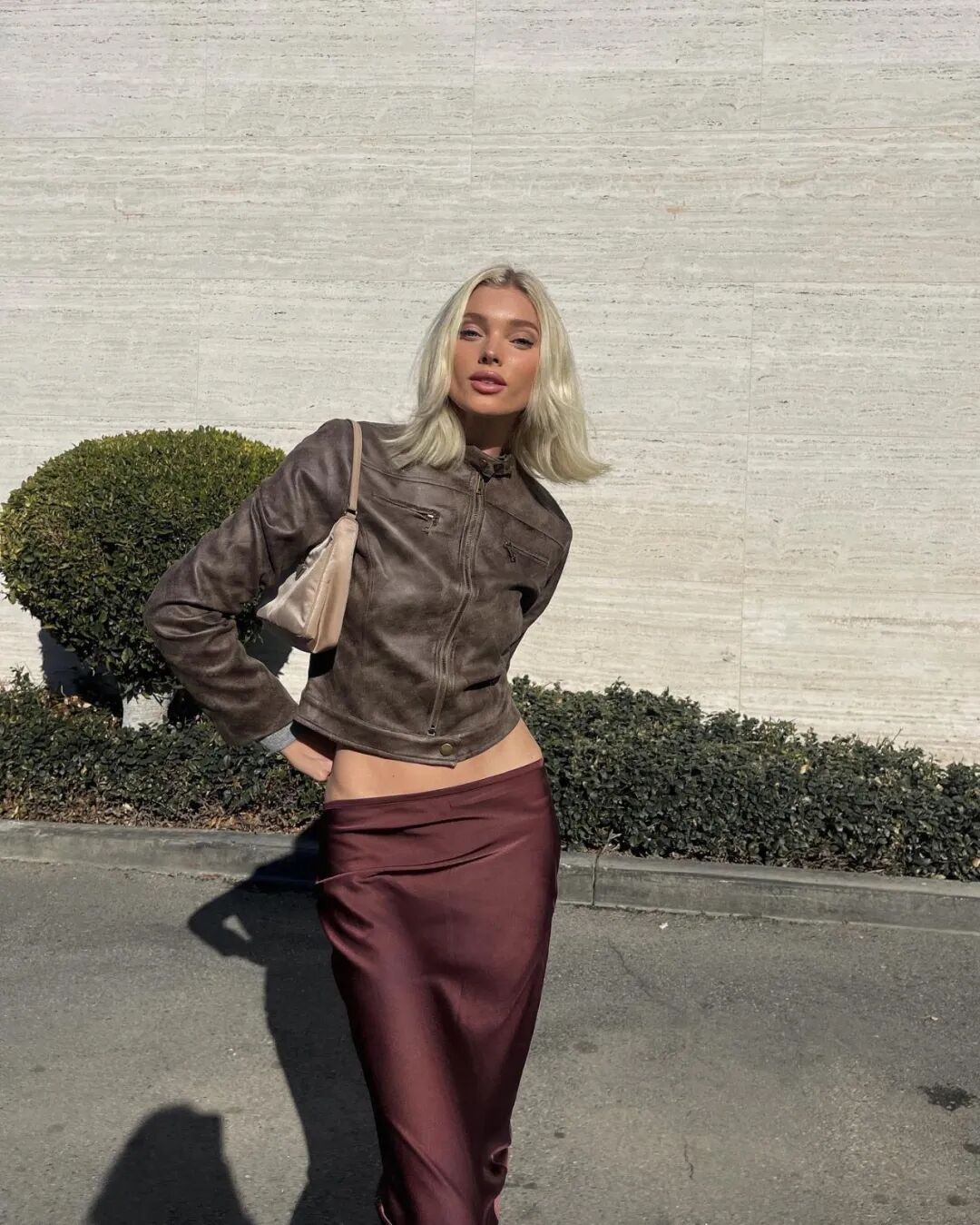 沉迷美拉德的Elsa Hosk,用一条低腰缎面裹身裙,搭配厚实的皮夹克,傲人身材在漫不经心间展露,女人味和酷飒劲儿都臣服于她的辣妹风情。