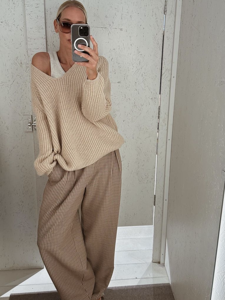 羊绒衫也不用追求厚实,薄薄一层贴合身体轮廓,带来的温暖已然很足,博主Alex Rivière近来这件就有恰到好处的厚度,搭配阔腿裤衬得四肢挺拔纤长。